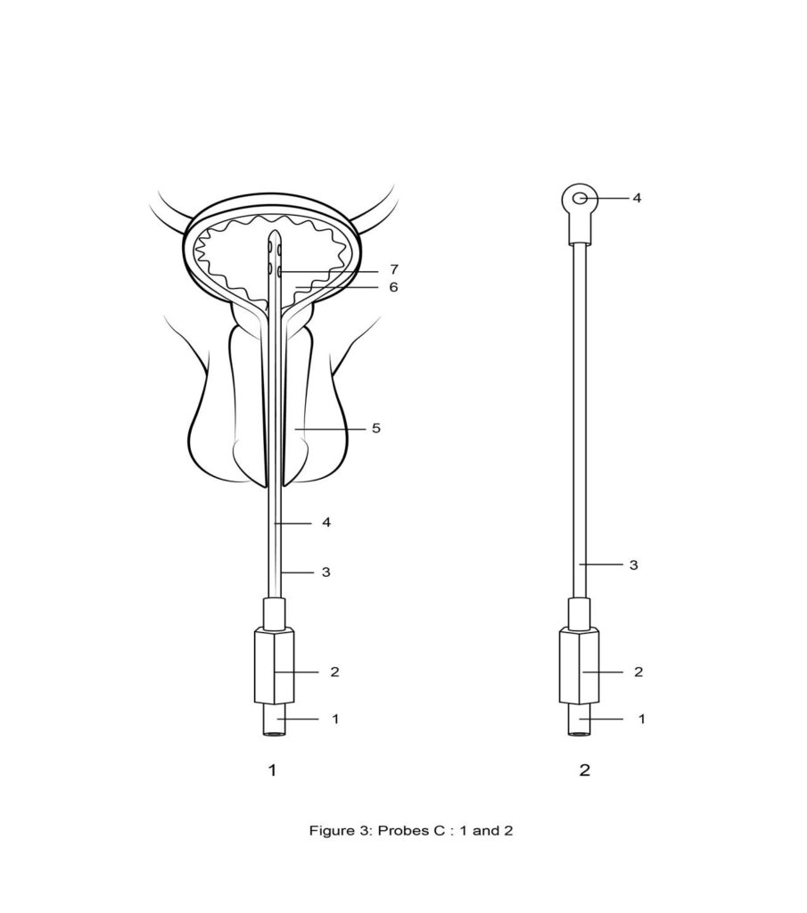 10) The device as claimed in claim 1 is characterized by probes C (Figure:3) A pair of probes for invasive application of electricity inside body cavities with one