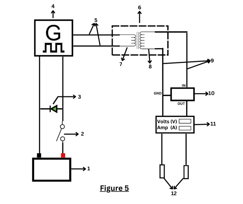 5)The device as claimed in claim 1 is characterized by a function (Signal) generator (Figure: 5-4) which converts DC current from the power bank to an AC current with a variable frequency 0.1 Hz to 100 Ghz but not necessarily limited to the range. (A technical advance over the prior arts)
