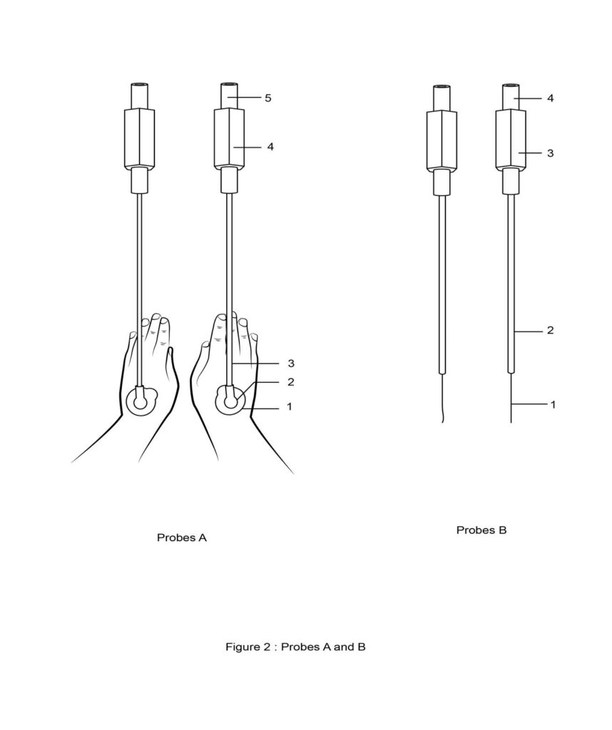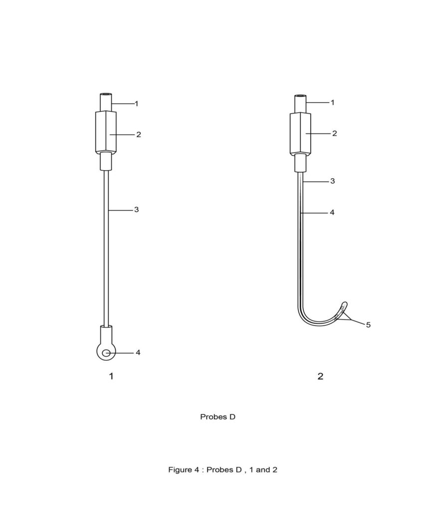 2) Probes B: (Figure:2) A pair of probes for invasive application of electricity. They have a proximal end with DC male type pins (Figure:2, probes B-3)